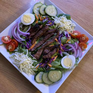 Cris lettuce mixed with carrots & red cabbage, topped with chicken, bacon, tomatoes, eggs, cheese, onion, cucumber, broccoli, bell peppers, & croutons with choice of dressing.